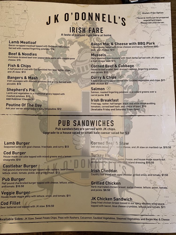 J K O'Donnell's Irish Ale House, located in Fort Wayne, IN, offers a cozy and inviting atmosphere perfect for a casual yet delicious dining experience. The menu features authentic Irish dishes such as seafood chowder, shepherds pie, and fish & chips. Customers rave about the flavorful meals, with highlights including the scotch eggs, the chicken sandwich with garlic aioli, and the homemade chips. The bar provides a wide selection of ales and a welcoming environment for both lunch and lively evenings. With a friendly staff and a variety of options to choose from, J K O'Donnell's is a must-try for anyone in the area looking for a taste of Ireland with a side of neighborhood charm.